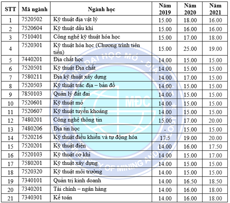 Năm 2021, Trường Đại học Mỏ - Địa chất xét tuyển các ngành với mức tăng nhẹ ở một số nhóm ngành tuy vậy vẫn giữ ổn định trong khoảng 15 - 22.5 điểm.